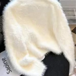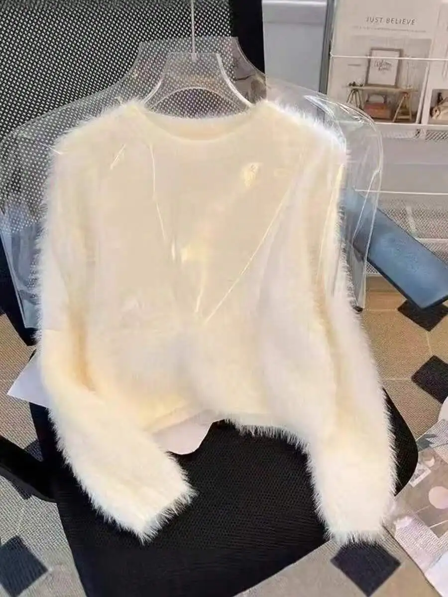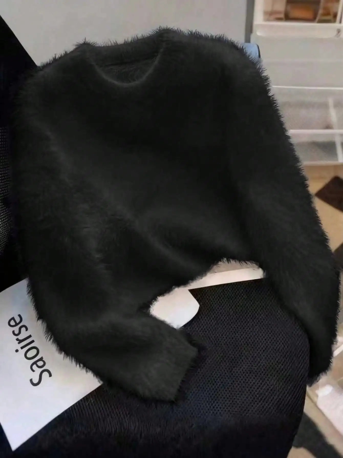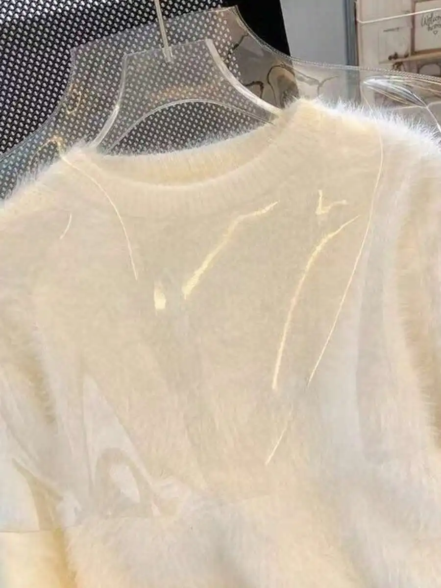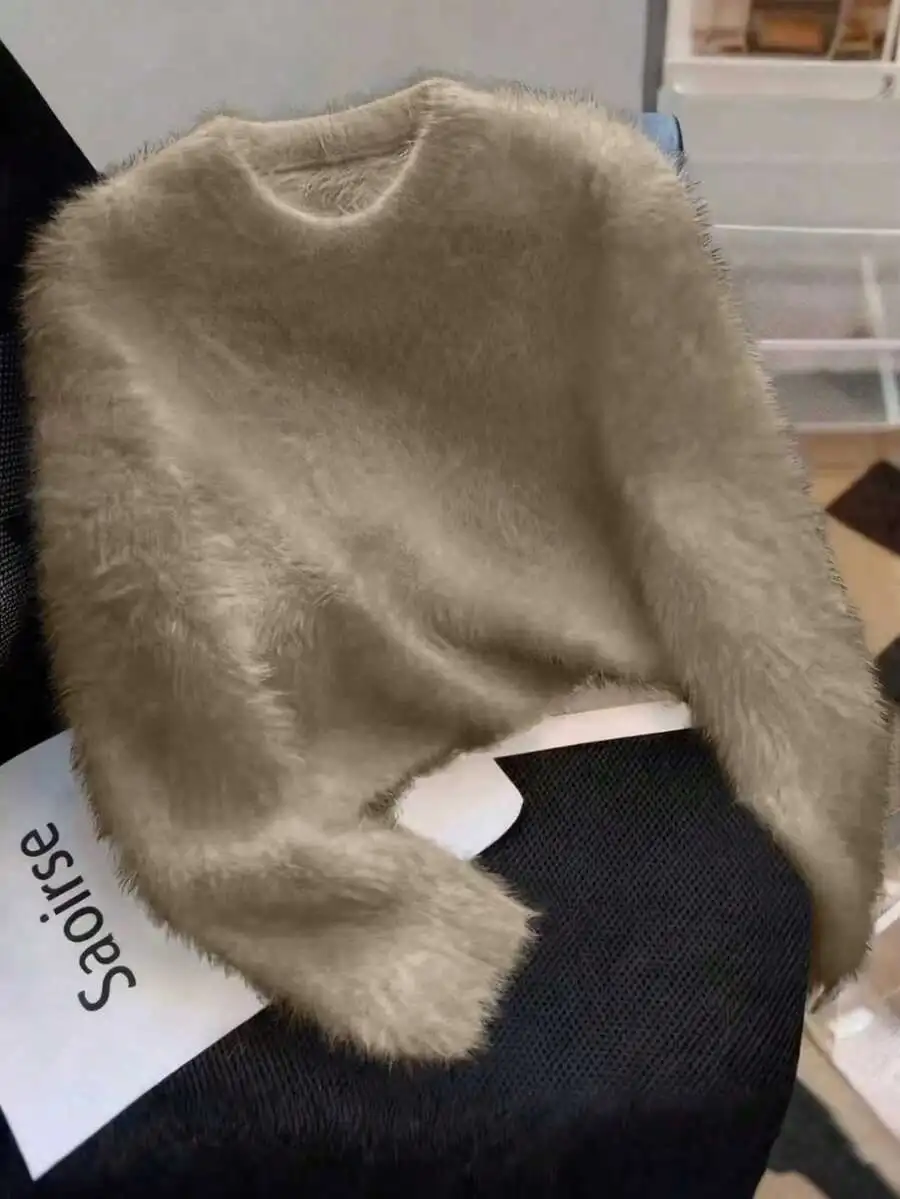 This cozy pullover sweater features a soft fuzzy texture with a relaxed fit and classic crew neck. Designed as a short knit top, it offers effortless style for casual autumn and winter wear. The plush mink cashmere blend ensures warmth and comfort while maintaining a chic silhouette.