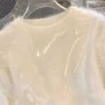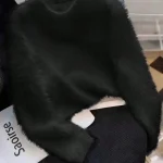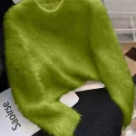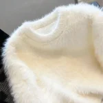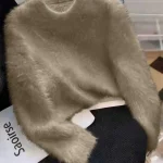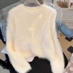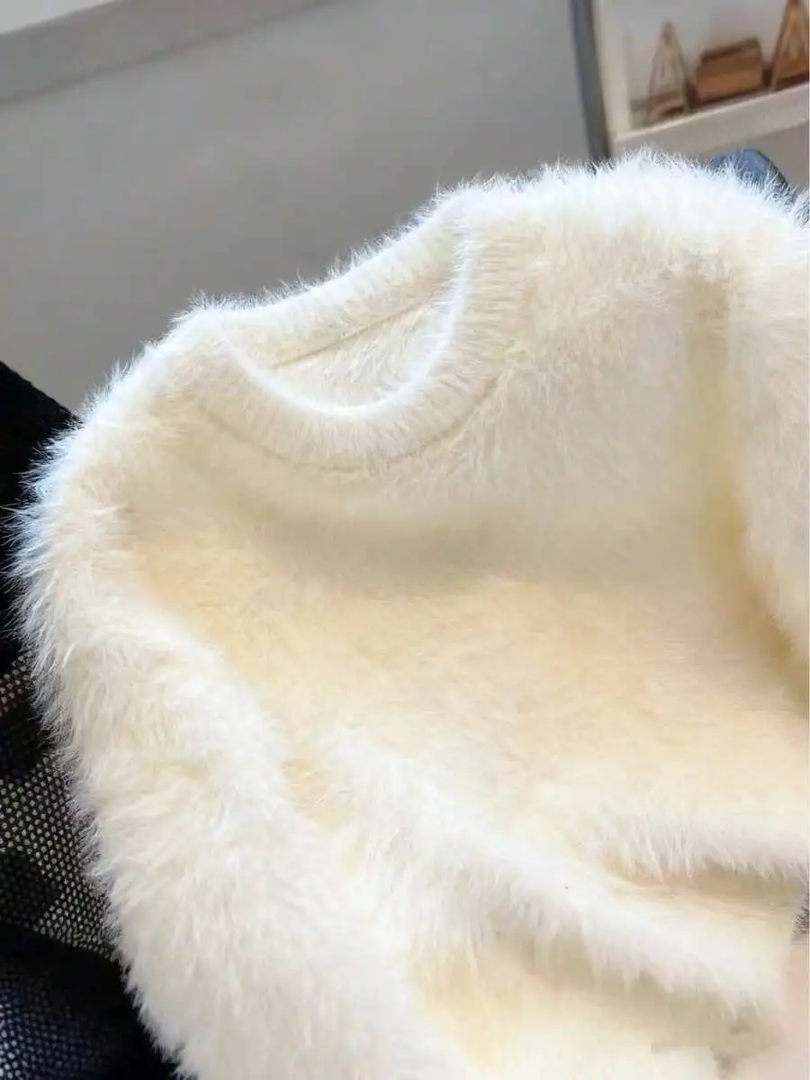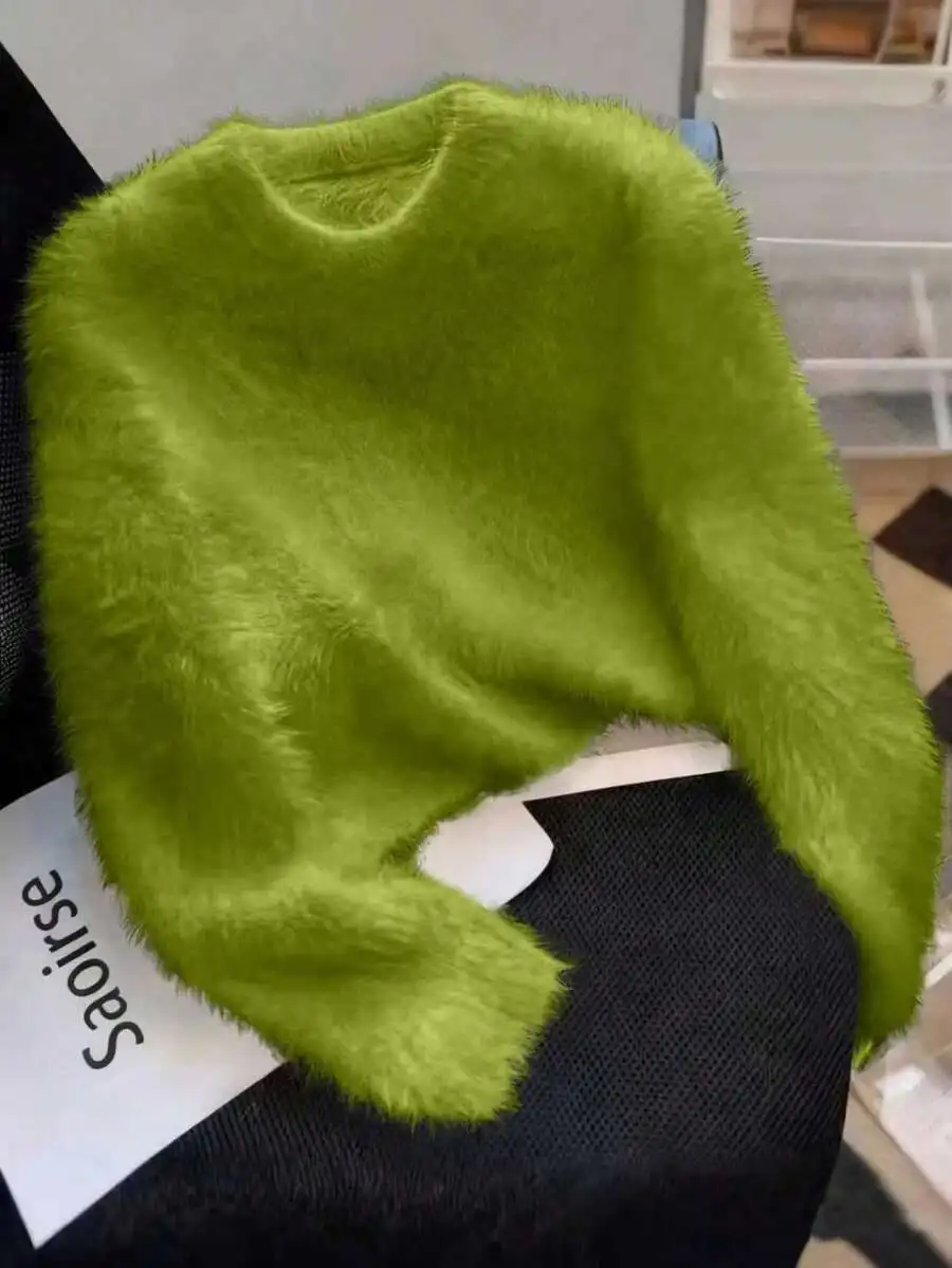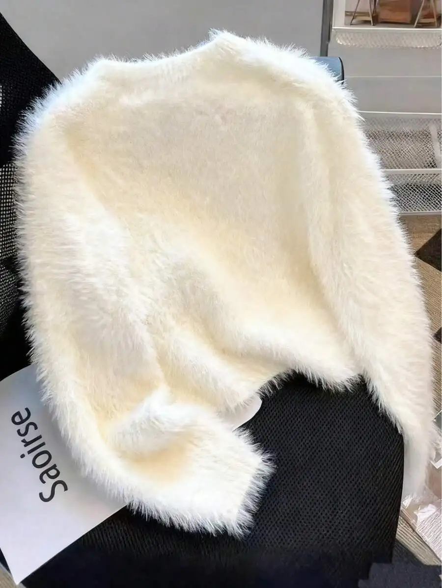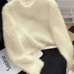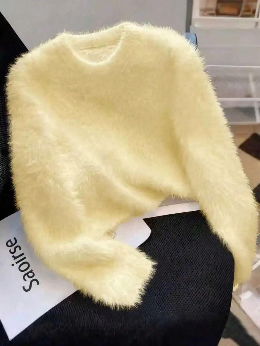 This cozy pullover sweater features a soft fuzzy texture with a relaxed fit and classic crew neck. Designed as a short knit top, it offers effortless style for casual autumn and winter wear. The plush mink cashmere blend ensures warmth and comfort while maintaining a chic silhouette.